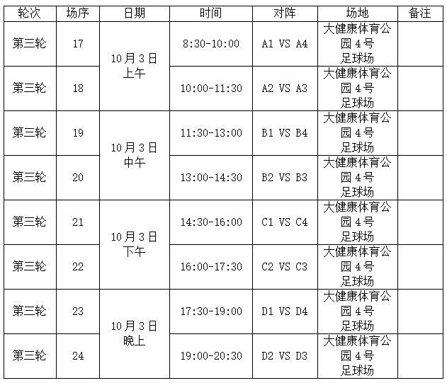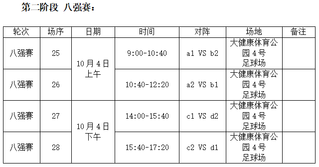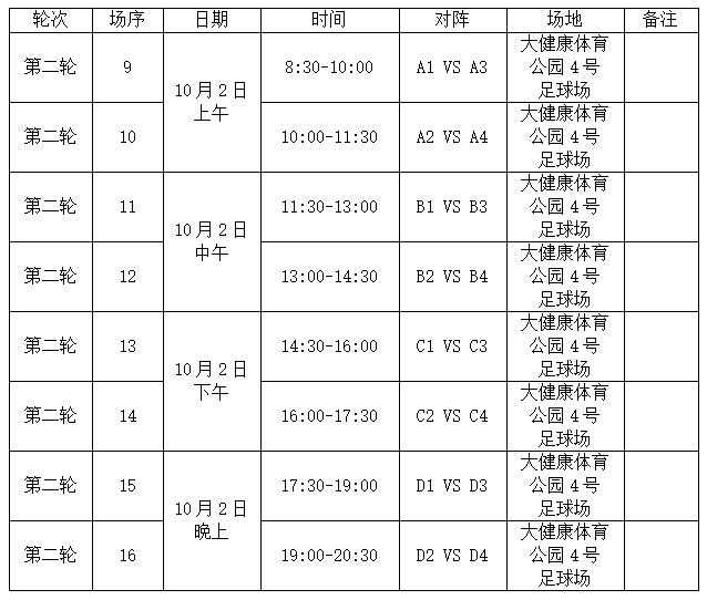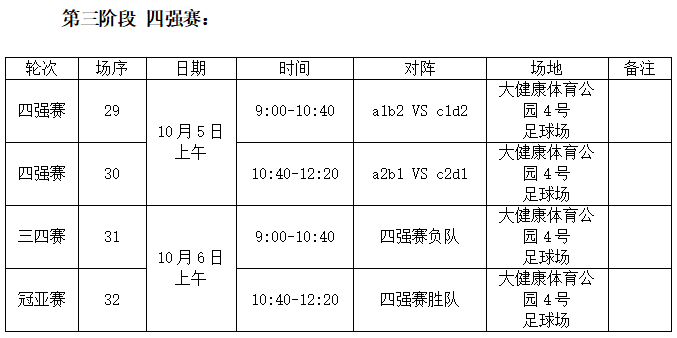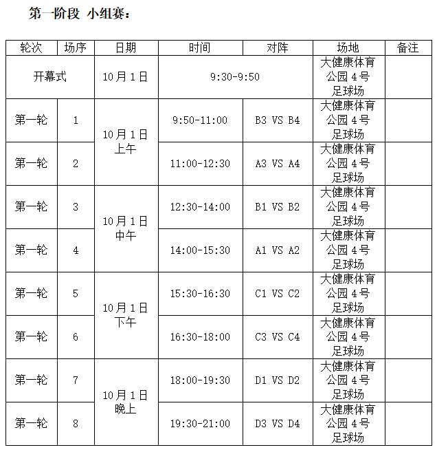 参加本次大赛的16支球队中,有来自北京、天津、石家庄、保定的4支球队,新区三县、各片区的12支球队。目前,赛程已确定,10月1日开赛,10月6日决赛。具体赛程如下:
