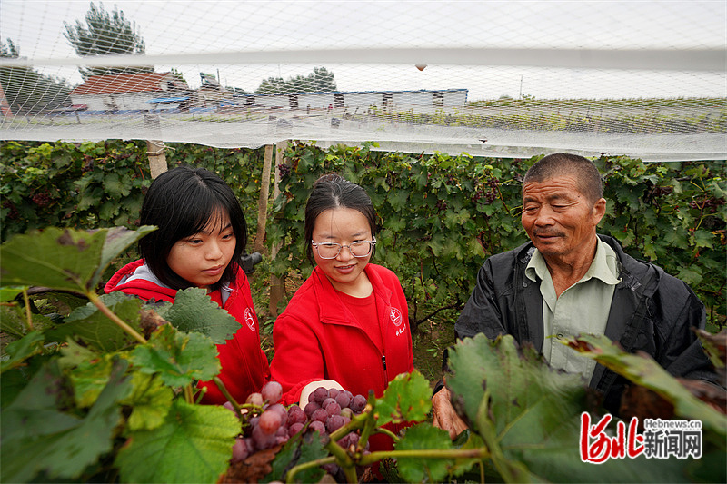 9月24日下午,曲周前衙科技小院的中国农业大学研究生张桂花(中)、贺晨(左)来到葡萄园,和种植户王金朝一起查看葡萄生长情况。河北新闻网记者 赵新宇摄