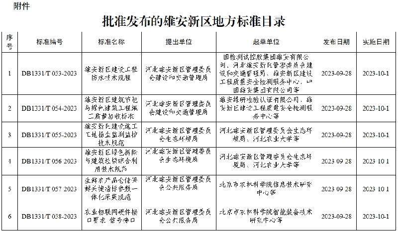 附件:批准发布的雄安新区地方标准目录