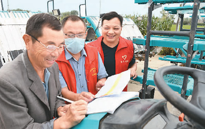 财政惠农补贴提高了广大农户购买农业机械的积极性,为农业现代化发展提供了有力保障。图为近日,江苏省淮安市洪泽区农业农村局工作人员为东双沟镇山阳村育秧大户办理中央财政农机购置补贴手续。刘彬 摄(人民视觉)
