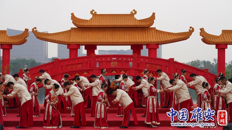 迈火盆、跨马鞍、行三拜之礼、举案齐眉、订立婚书、交换信物、共饮合卺酒……在庄重高雅又喜庆的仪式现场,新人默默许下相敬、互爱、相守一生的誓言。据悉,参加此次集体婚礼的40对新人不仅有来自五湖四海的有志青年,也有为雄安新区建设添砖加瓦的热血青年。他们当中的绝大多数人长年累月坚守在项目一线,几经波折才与爱人缘定终身,在这一刻开出幸福的花朵。