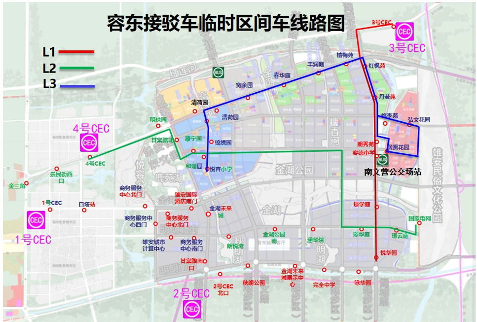 容东定线接驳车L3路:(1号CEC-居贤花园),5时至活动结束。甩站“1号CEC、白塔站、商务服务中心北门(下行)、商务服务中心西门、雄安城市计算中心、商务服务中心南门、金湖未来城”。