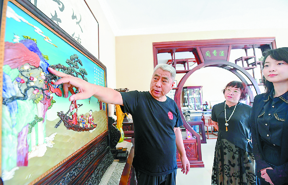 九州镇南汉村非遗传承人周洪俊为顾客介绍百宝嵌作品《麻姑献寿》制作细节。通讯员孙宝宇 摄