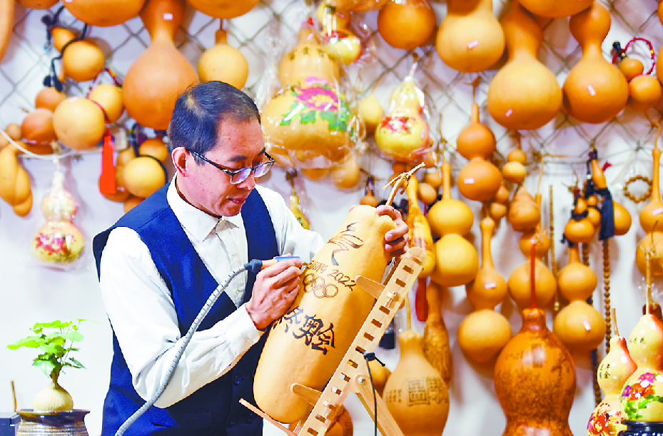 廊坊市非物质文化遗产葫芦烙画传承人吴宗正制作烙画葫芦作品“魂牵冬奥”。通讯员孙宝宇 摄
