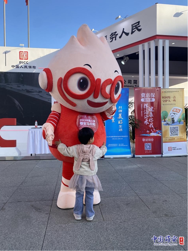 小朋友在雄马嘉年华上拥抱中国人保吉祥物。中国雄安官网发
