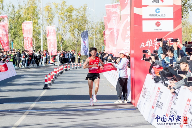 马拉松男子组冠军秦仲富撞线瞬间。中国雄安官网牛思佳 摄