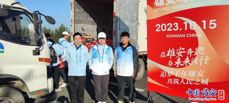 雄安集团交通公司志愿者、半马衣物存取组长李靖志愿服务组合影。中国雄安官网发