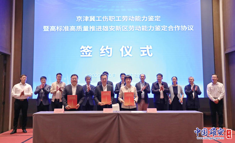签约仪式现场,北京、天津、河北人力资源和社会保障部门共同签署了《工伤职工劳动能力鉴定暨高标准高质量推进雄安新区劳动能力鉴定合作协议》,就三地工伤职工劳动能力初次鉴定相互委托、三地支持雄安新区劳动能力鉴定工作高标准高质量发展达成合作。