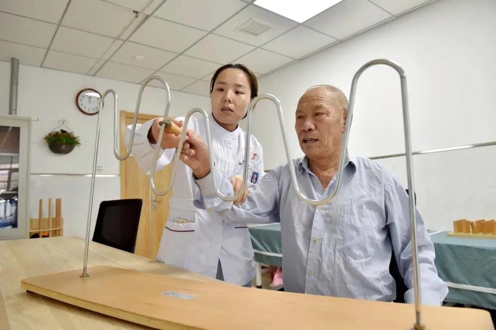 9月26日,邢台市南和区人民医院医养中心工作人员协助老人进行益智训练。新华社记者朱旭东 摄