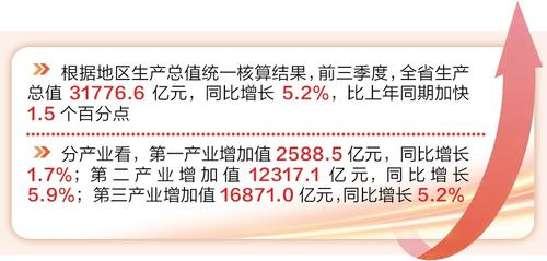 根据地区生产总值统一核算结果,前三季度,全省生产总值31776.6亿元,同比增长5.2%,比上年同期加快1.5个百分点。分产业看,第一产业增加值2588.5亿元,同比增长1.7%;第二产业增加值12317.1亿元,同比增长5.9%;第三产业增加值16871.0亿元,同比增长5.2%。