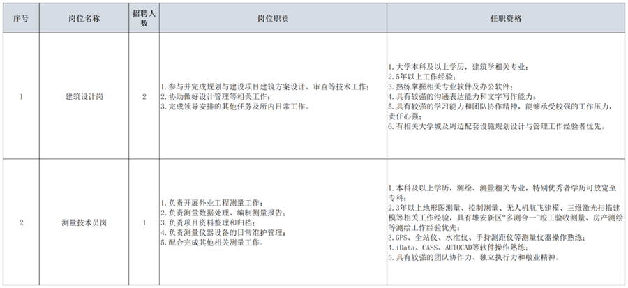 河北雄安人力资源服务有限公司(以下简称雄安人力公司)根据工作需要,现面向社会公开招聘建筑设计岗、测量技术员岗工作人员,诚邀您的加入!
