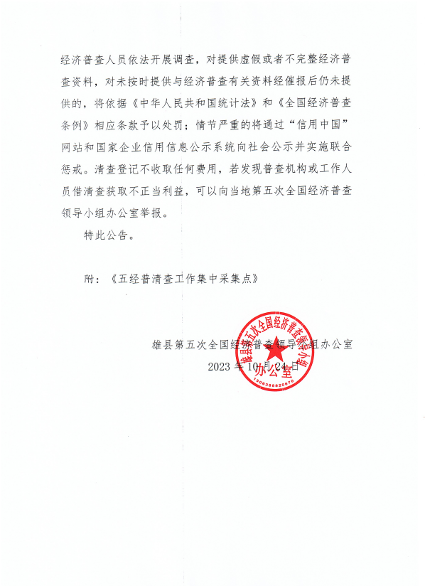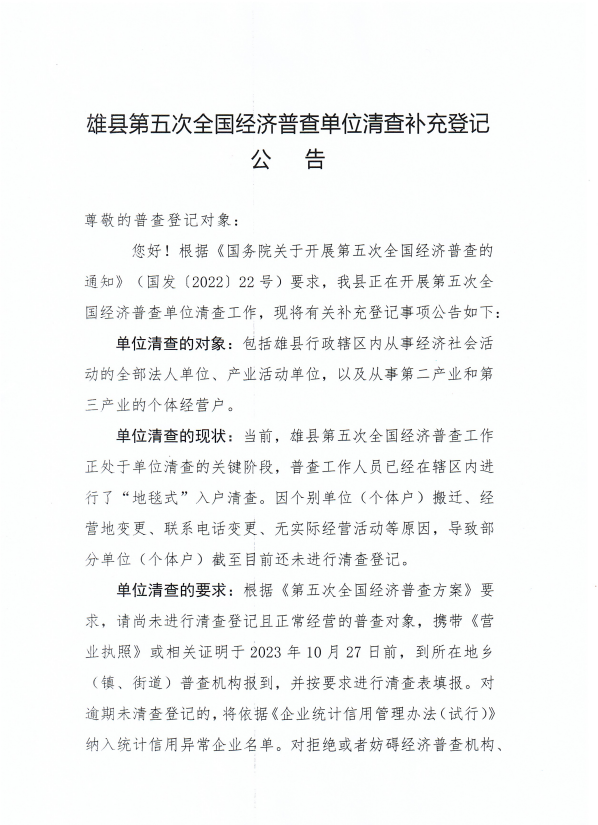 雄县第五次全国经济普查单位清查补充登记公告