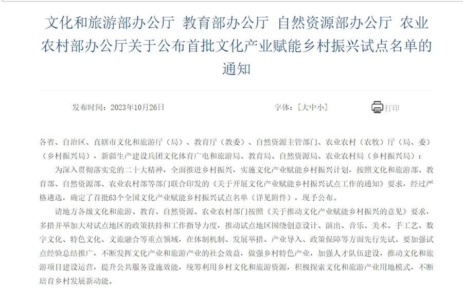 据文化和旅游部官网消息,10月26日,文化和旅游部办公厅、教育部办公厅、自然资源部办公厅、农业农村部办公厅最新发布通知,经过严格遴选,确定了首批文化产业赋能乡村振兴试点名单,予以公布,其中河北3县上榜↓↓↓