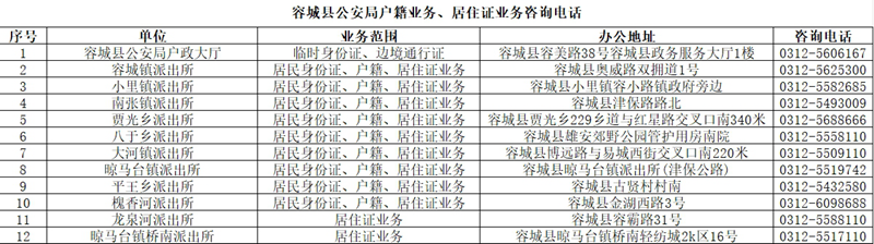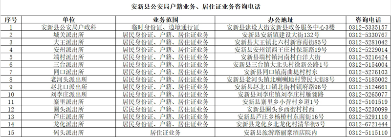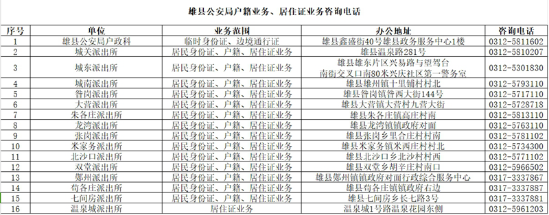 附:雄安新区各级公安机关户政窗口地址及咨询电话