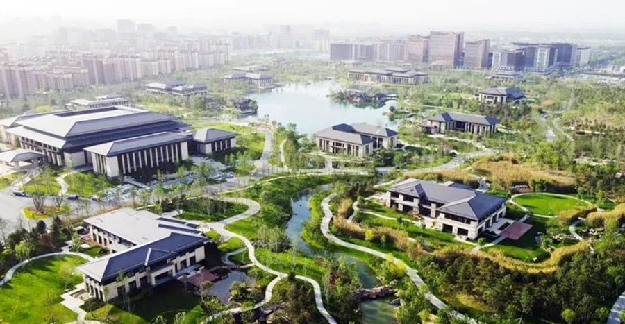 雄安国际酒店是集国际峰会、政务接待、商务旅居于一体的东方园林式酒店,包含1座国际酒店、1座国际会议中心和13栋贵宾接待楼。建筑风格古今交融,布局灵活有序,与自然环境完美结合,既有古典神韵又具有现代气息。