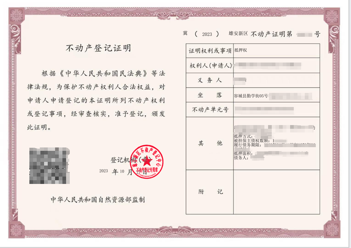 首笔预售商品房抵押权预告登记自动转本登记后电子证照。中国雄安官网发