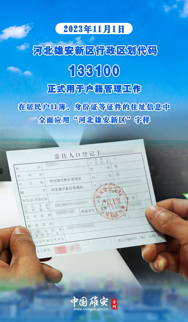 11月1日,河北雄安新区行政区划代码133100正式应用于户籍管理工作,在居民户口簿、身份证等证件的住址信息中,全面应用“河北雄安新区”字样,发放带有“河北雄安新区”字样的身份证及户口簿。不论是第一次拿到身份证的小朋友,还是换领到新身份证的疏解人员,还有刚刚完成新生儿出生登记的父母,大家拿到带有“河北雄安新区”字样的身份证或者户口簿时,脸上都洋溢着幸福的笑容。