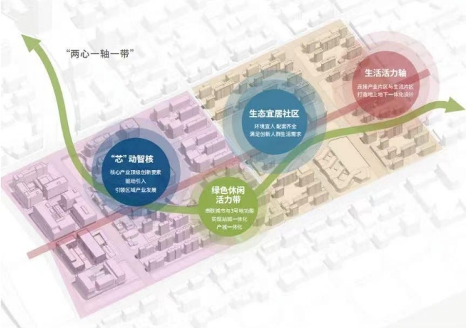 中交未来科创城位于雄安站东南侧约200米,占地约881亩,总建筑面积约140万㎡,总投资约172亿元。项目规划“两心一轴一带”空间格局,其中西区芯动智核与雄安站通过地下通道快捷连通,由总部办公区、产业承载区、科创核心区、研发配套区、科技服务区五大组团,组成现代科创产业生态体系。东区生态宜居社区,围绕5-15分钟社区生活圈概念,打造多元业态的24小时活力居住区。
