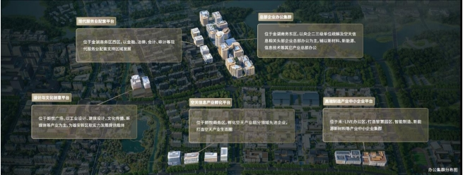 空天信息产业孵化平台位于朗悦商务区,孵化空天产业细分领域先进企业,打造空天产业生态圈。现代服务业配套平台位于金湖商务区西区,以金融、法律、会计、审计等现代服务业配套支持区域发展。
