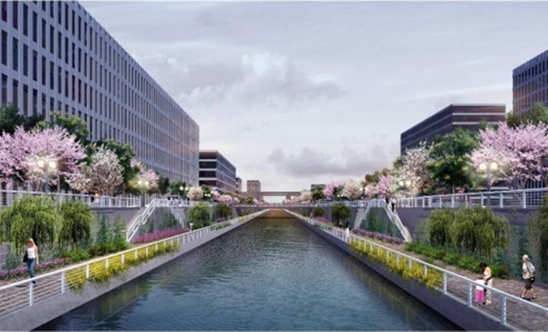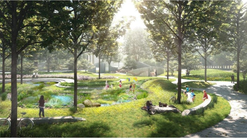 (5)生态:项目与新月公园实现无缝连接,高铁人流可通过其带状生态绿廊直达项目。园区内部配套建设公园总面积约2.1万㎡。同时规划建设景观河道,项目整体生态环境优越。