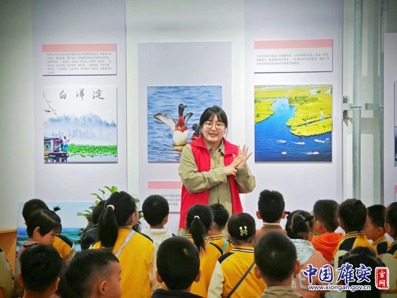 工作人员向孩子们讲解白洋淀生态环境变好的过程。中国雄安官网李鑫 摄