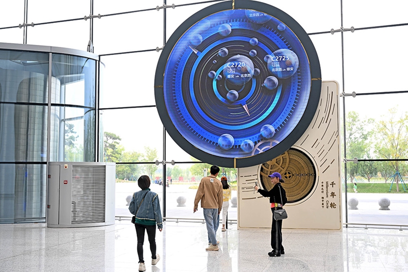 乘客在雄安站“千年轮”前拍照留念。河北日报记者张昊 摄