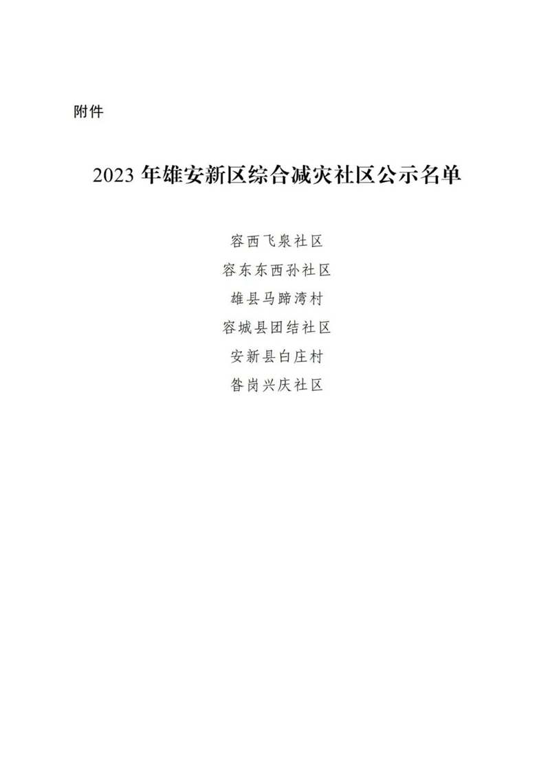 为认真贯彻落实《雄安新区综合减灾社区认定管理办法(试行)》要求,2023年雄安新区安委办印发《关于开展2023年雄安新区综合减灾社区认定工作的通知》,严格按照“控制数量、提升质量”的原则,认真开展了综合减灾社区创建工作。创建过程中,严格创建标准,部门通力协作,在逐级申报、自查自评、第三方评估和有关部门综合评判等环节的基础上,经雄安新区安全管理委员会办公室同意,现公布容西飞泉社区等6个社区(行政村)为2023年雄安新区综合减灾社区(名单附后)。