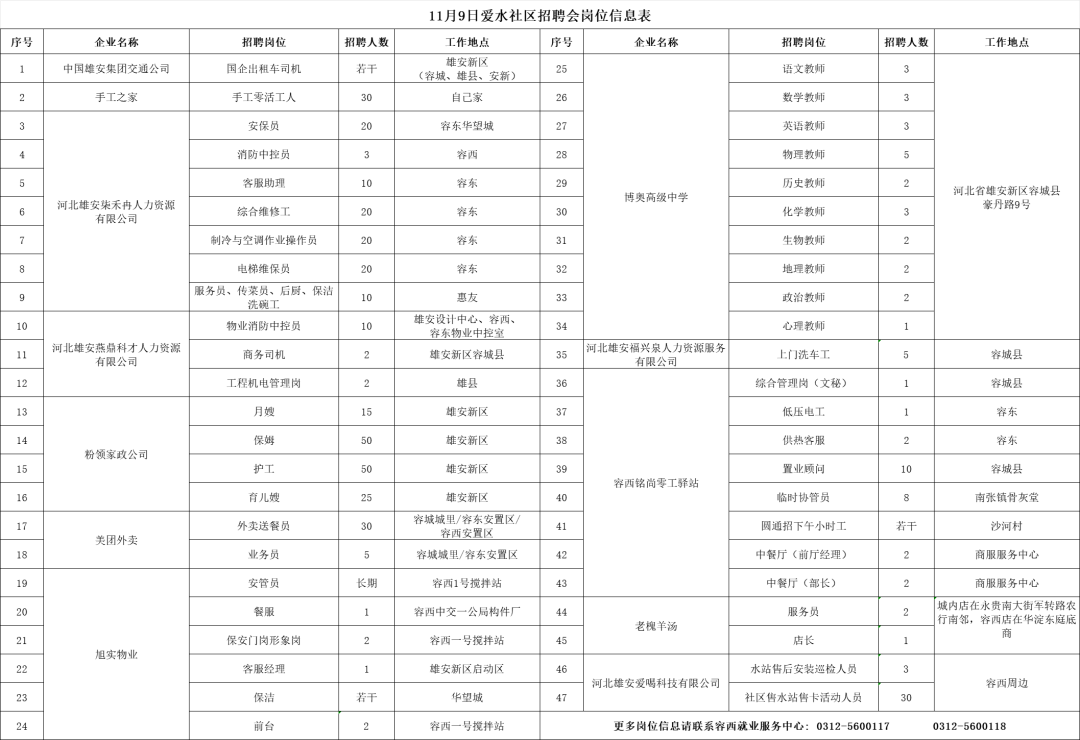 更多岗位信息可于容西就业服务中心(容霸路31号)现场咨询;也可进入雄安公共招聘网(https://rongxi.xatalent.cn/)免费注册,登录个人会员后搜索更多岗位进行投递。
