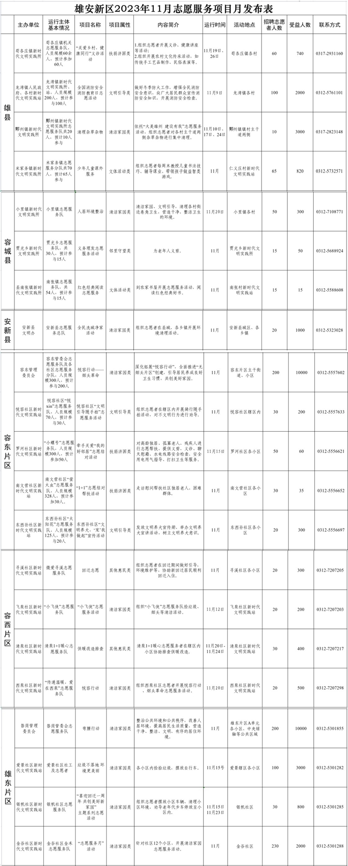 为弘扬社会主义核心价值观,培育志愿服务文化,打造“志愿服务之城”,助力形成“城市很美丽 人民很文明”的新形象,2023年11月,雄安新区三县、各片区、各相关单位计划开展志愿服务项目98个。雄安新区文明办选取了20个具有代表意义的志愿服务项目进行集中发布。