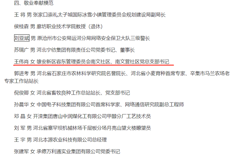 日前,省精神文明建设委员会决定,授予杜明庭等20名同志第九届河北省道德模范称号,授予王树磊等20名同志第九届河北省道德模范提名奖。其中,雄安新区容东管理委员会南文社区、南文营社区党总支书记王伟肖入选第九届河北省道德模范名单。