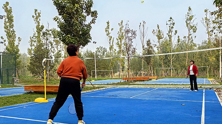 10月30日,雄安新区容东片区明珠园小区居民在附近羽毛球场地打球。河北日报记者郝东伟 摄