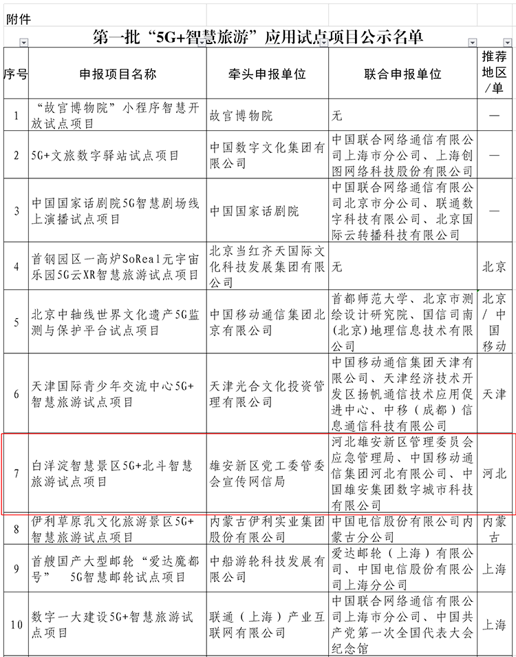 日前,文化和旅游部、工业和信息化部确定第一批“5G+智慧旅游”应用试点项目,全国各省市共30个项目入选,其中,由雄安新区党工委管委会宣传网信局牵头申报,河北雄安新区管理委员会应急管理局、中国移动通信集团河北有限公司、中国雄安集团数字城市科技有限公司联合申报的《白洋淀智慧景区5G+北斗智慧旅游试点项目》成功入选,该项目也是河北省唯一入选试点项目。