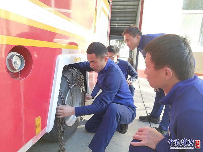 装备技师带领消防车驾驶员学习防滑链的安装方法。中国雄安官网发