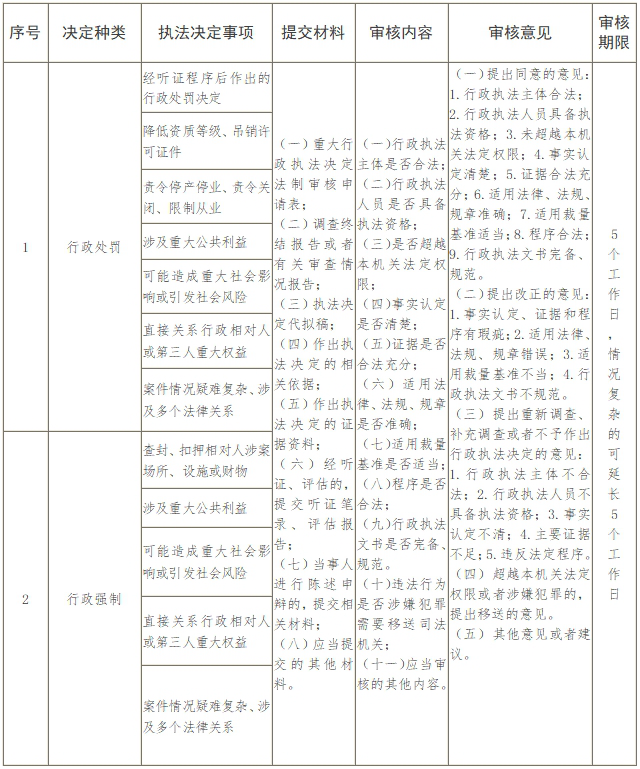 雄安新区综合执法局重大行政执法决定法制审核事项清单