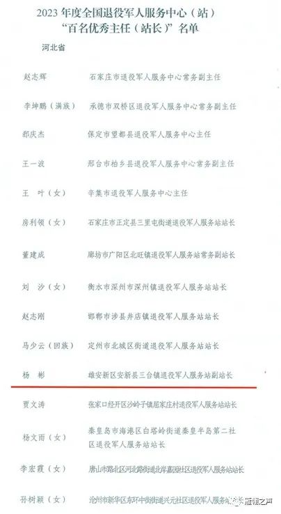 近日,退役军人事务部办公厅发布2023年度全国退役军人服务中心(站)“百名优秀主任(站长)”名单,对全国100名基层退役军人服务中心(站)主任(站长)给予通报表扬,安新县三台镇退役军人服务站副站长杨彬荣登榜单,为雄安新区唯一获此荣誉人员。