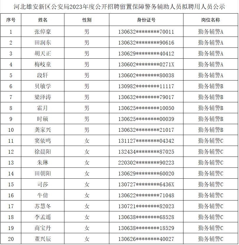 根据《河北雄安新区公安局2023年度公开招聘留置保障警务辅助人员公告》有关规定,经报名、笔试、资格复审、心理素质测评、体能测评、面试、体检和政治审查等程序,拟聘用20名同志为警务辅助人员,现予以公示(名单见附件)。