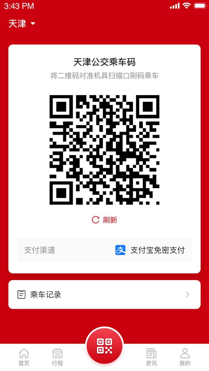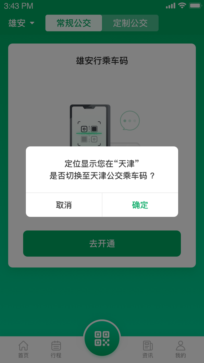 操作完成后展示“天津公交乘车码”,就可以使用“雄安行”APP在天津乘坐公交车啦!