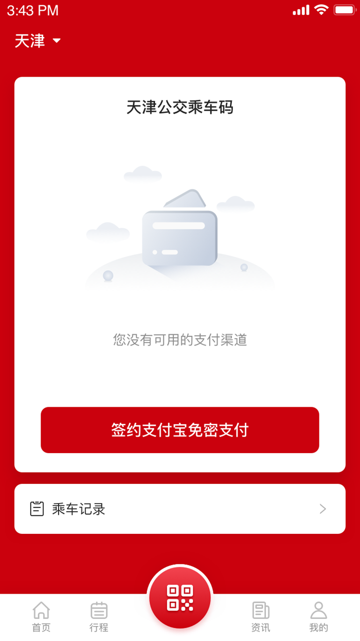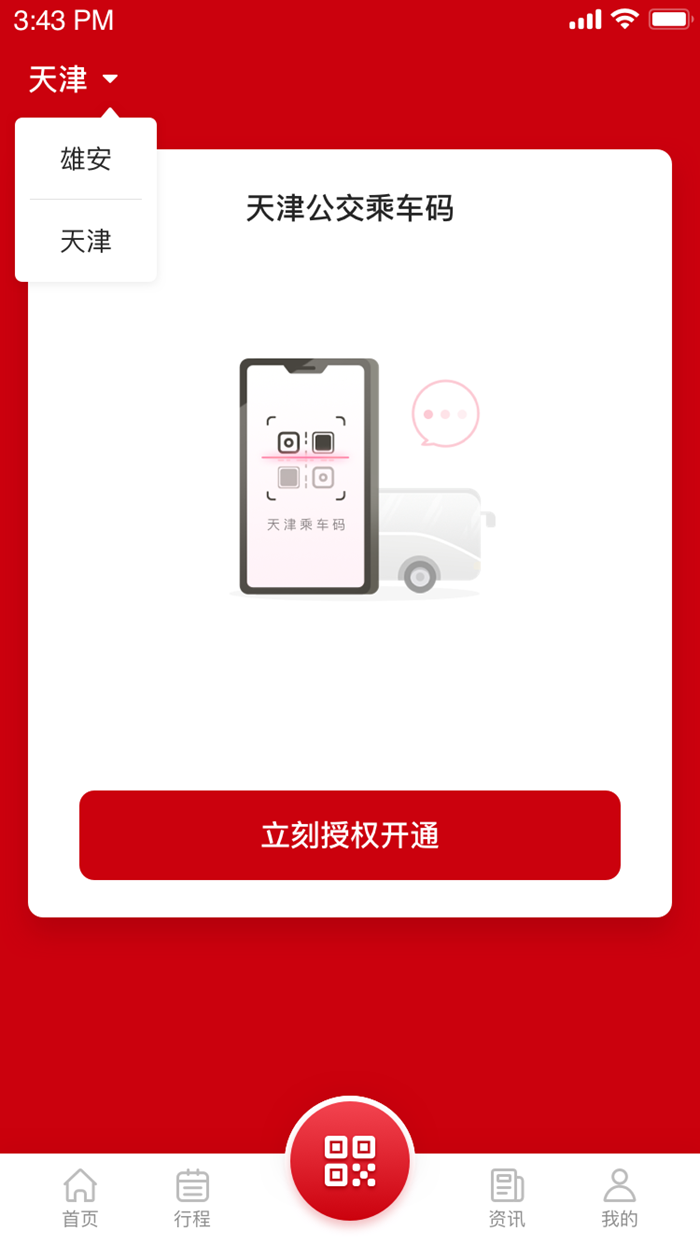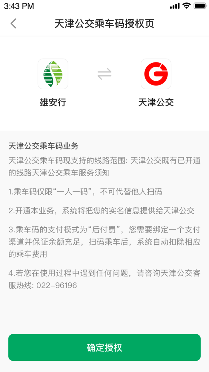 点击进入乘车码页面,开启手机定位,当您位于天津时可根据提示切换城市,也可进行手动切换。切换后点击“立刻授权开通”按钮,进入授权页面,点击“确定授权”。