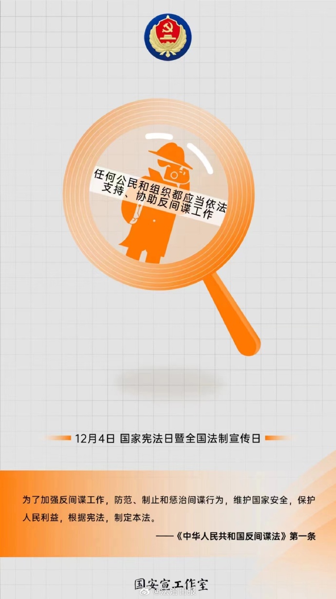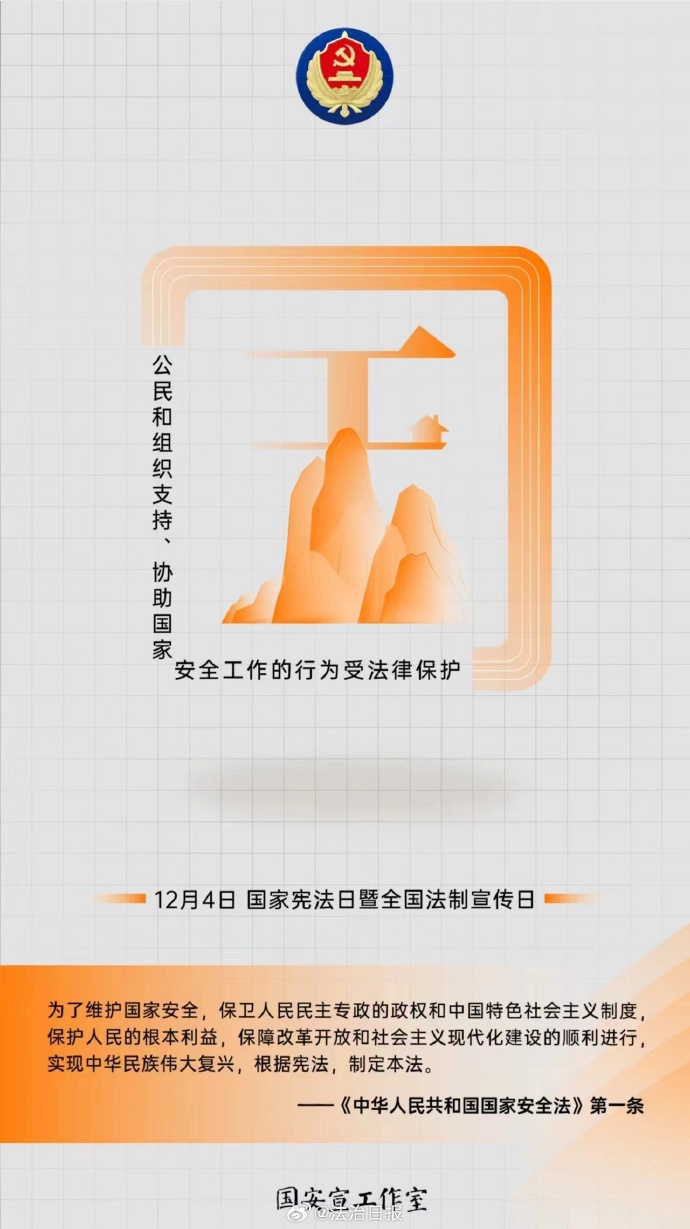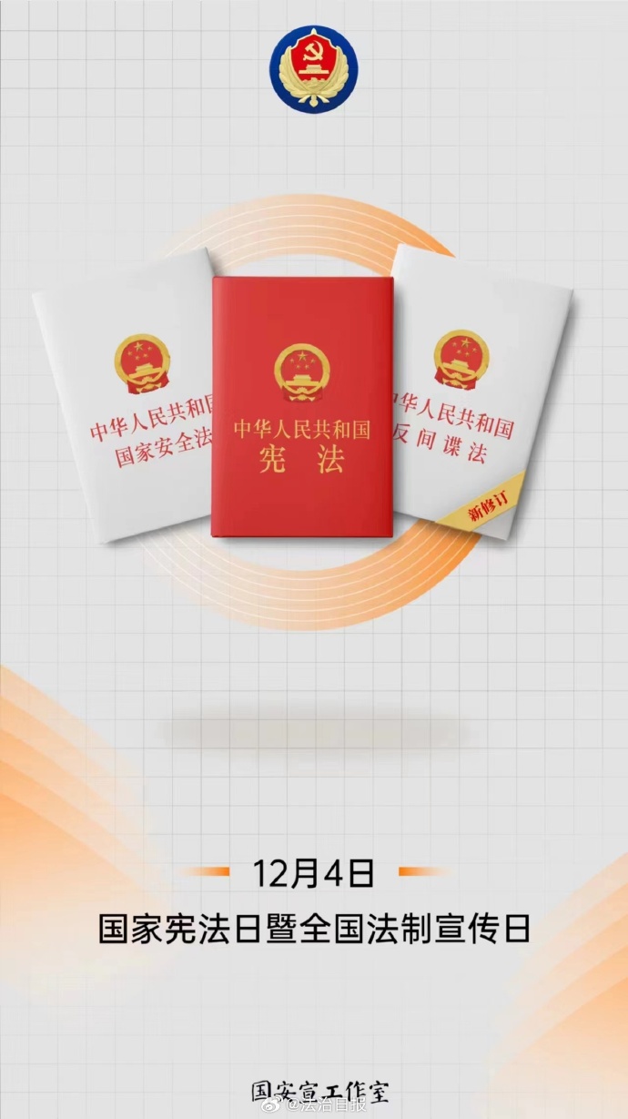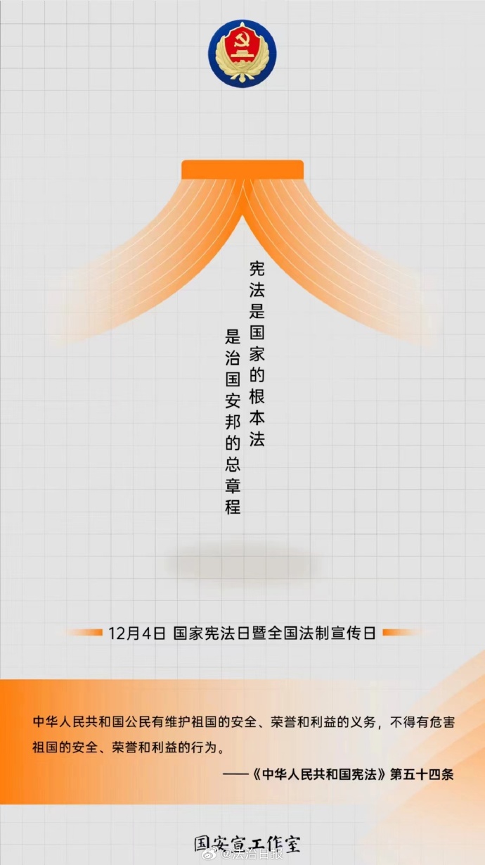 12月4日是国家宪法日。宪法为维护国家安全提供了根本法律遵循。让我们一起大力弘扬宪法精神,依法维护国家安全!