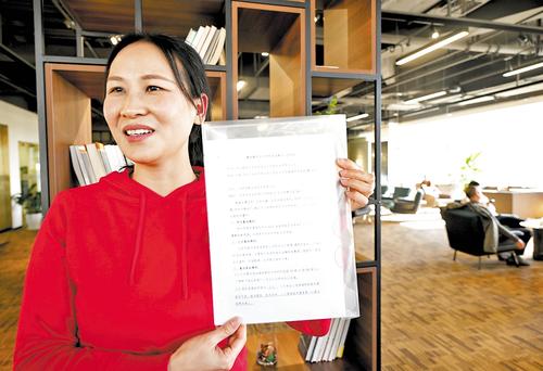 11月23日,北京信联众成技术有限公司副总经理龚玲展示当日签署的《雄安新区中关村科技园意向入园协议》。河北日报见习记者刘光昱 摄