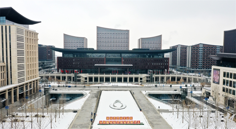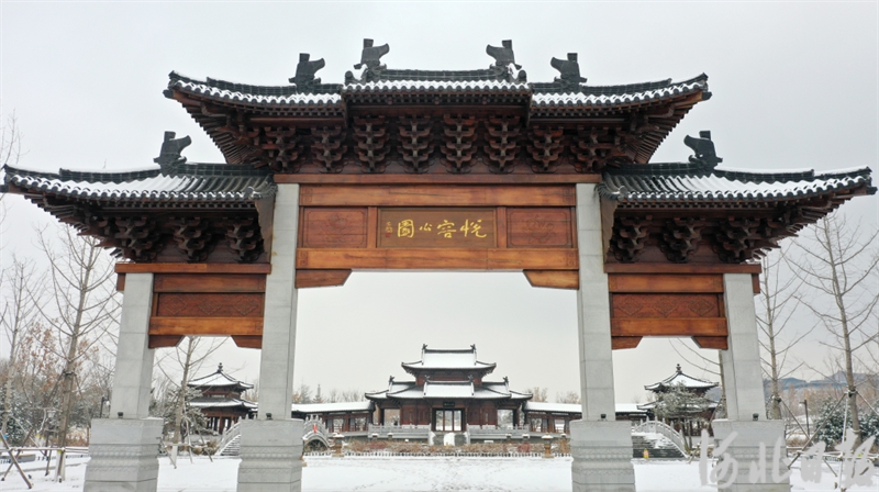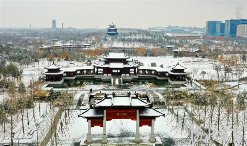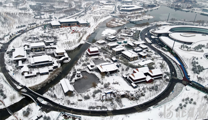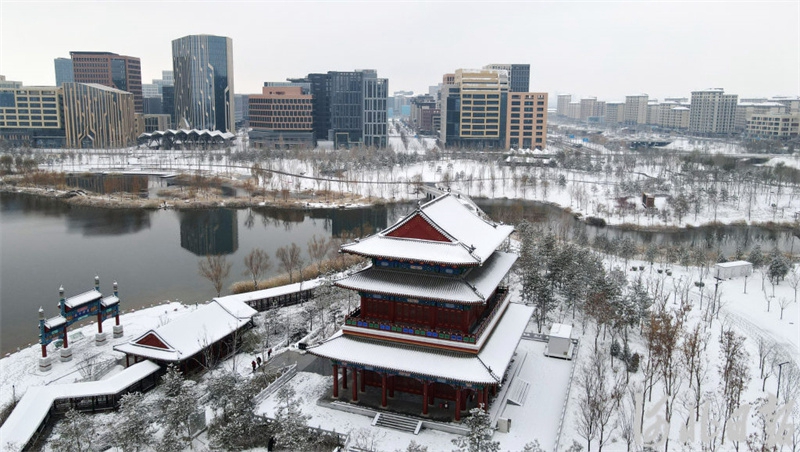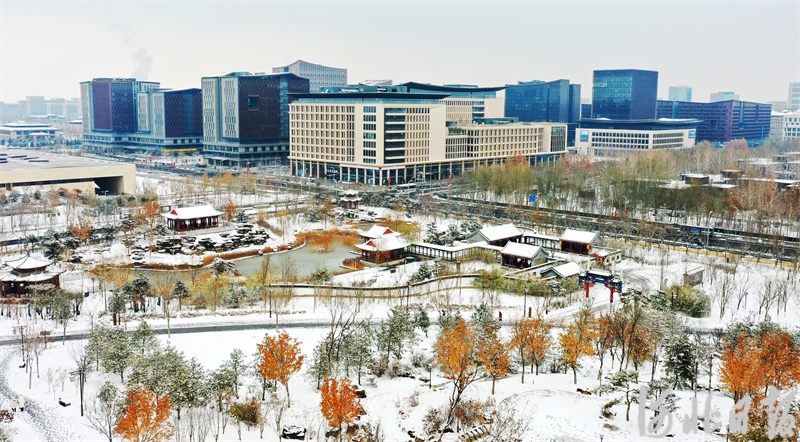 12月11日,悦容公园与商务服务中心雪景交相辉映。河北日报见习记者刘光昱 摄