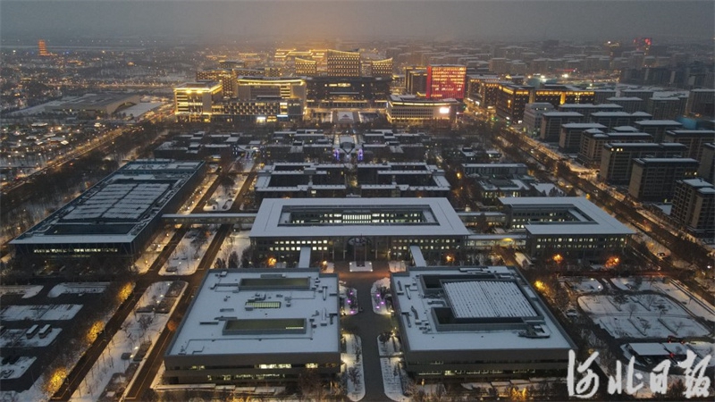 12月11日傍晚,笼罩在雪景灯光下的雄安市民服务中心。河北日报见习记者刘光昱 摄