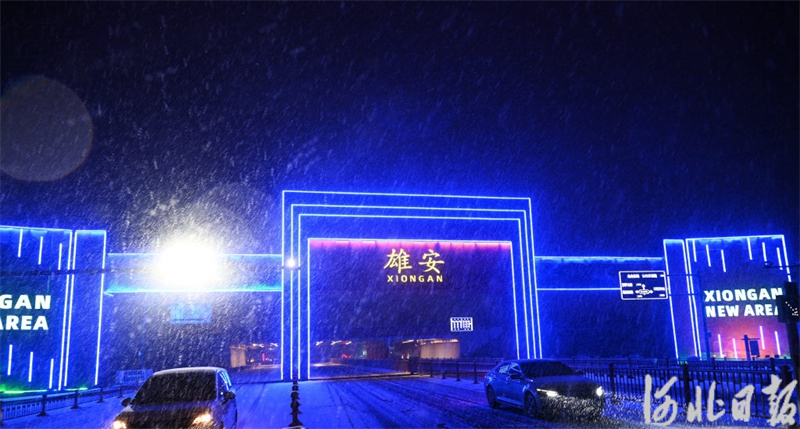 12月11日凌晨,雪中的雄安门,用光影定格未来之城。河北日报见习记者刘光昱 摄