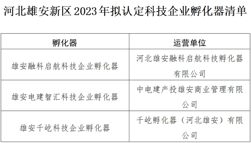 附件:河北雄安新区2023年拟认定科技企业孵化器清单