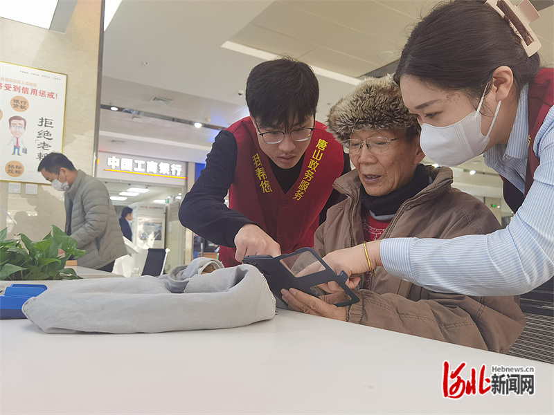 12月8日临近中午,在唐山市政务服务大厅,政务服务体验员马孟宇(右三)和工作人员一起,为付根长老人在手机上完成服务预约。河北日报记者王育民 摄