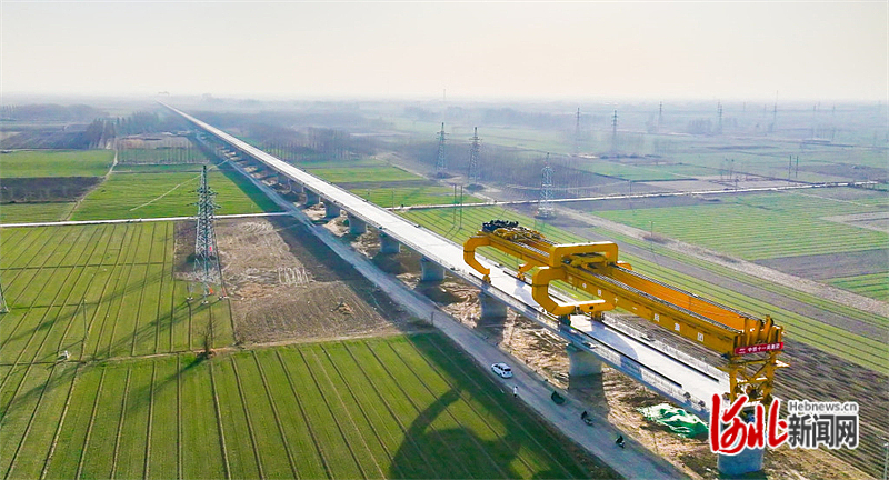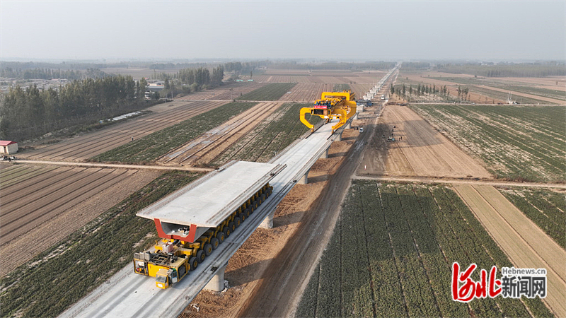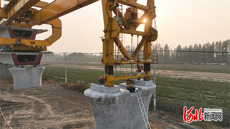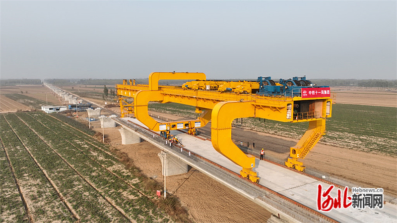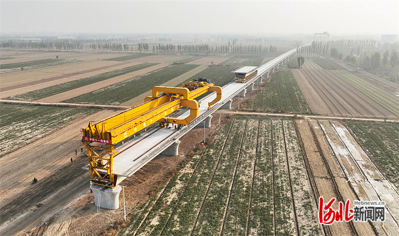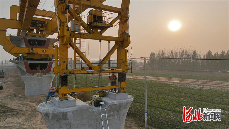 12月9日,中铁十一局建设者在雄安新区至商丘高速铁路(以下简称雄商高铁)河北段枣清特大桥项目现场进行架梁施工。