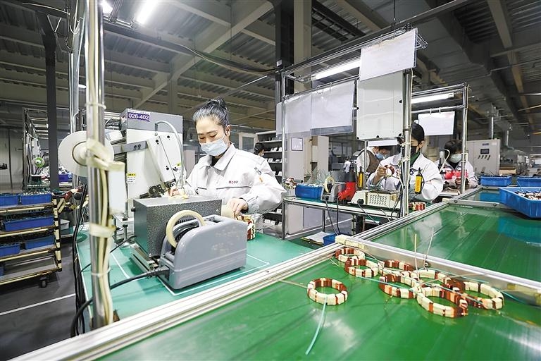 在霸州市一家新能源汽车配件生产企业生产车间,工人们正在加工电磁离合器线圈。记者贾珺 摄