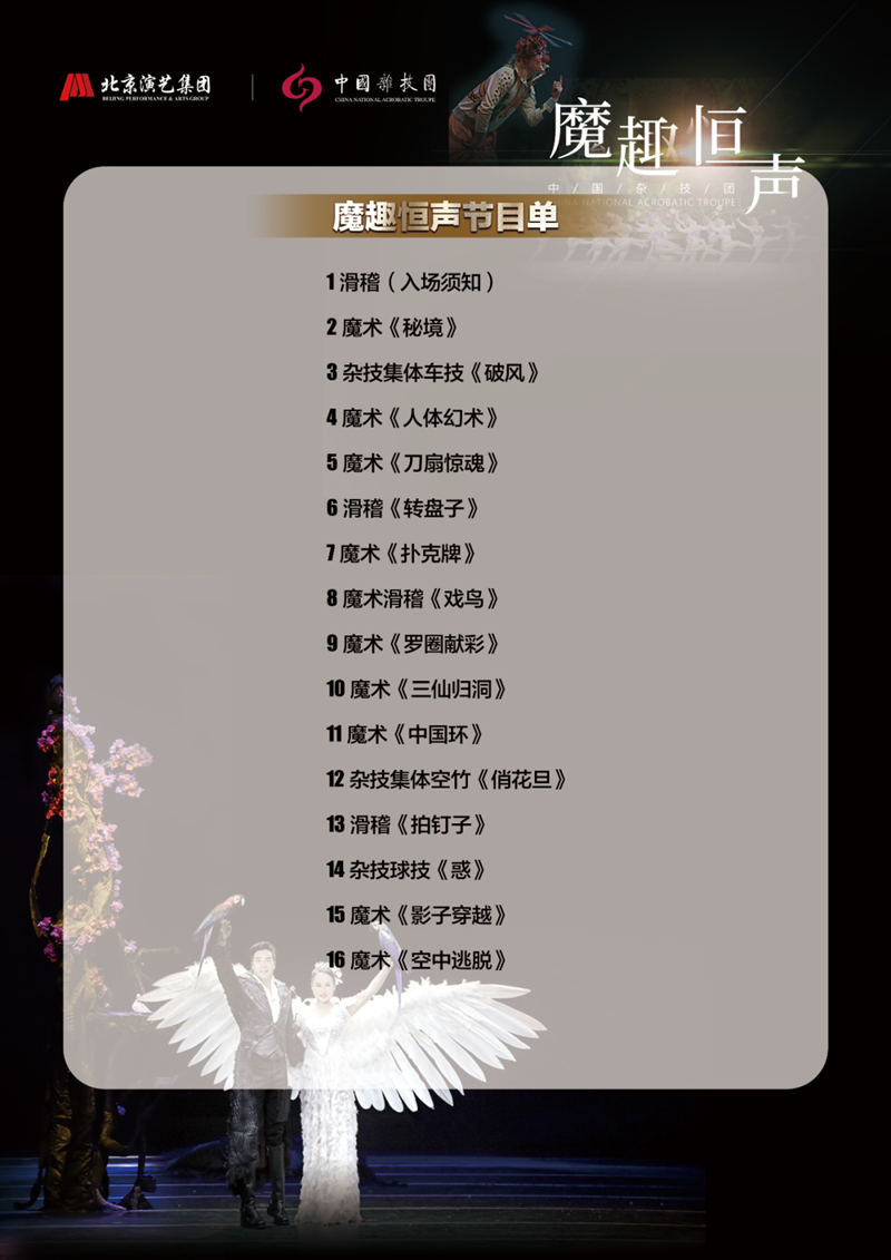 此次魔术杂技晚会集大型魔术、趣味魔术、近景魔术、传统戏法为一体,巧妙融合了杂技、口技、戏剧、舞蹈等多重艺术手段和跨界舞台元素,打造出一场古老与年轻、传统与现代共荣共生的艺术盛宴。让观众在享受多重魔幻体验的同时,置身感官世界,穿越时空,身临其境,超乎自然的神秘力量引领观众开启一场魔趣十足的奇幻旅程。