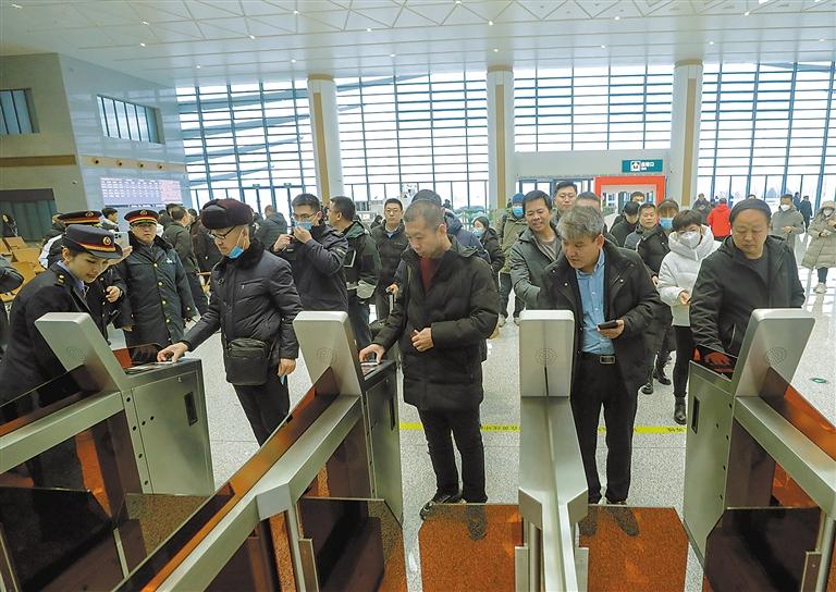 12月18日,津兴城际铁路开通首日,永清东站内乘客在闸机口检票准备乘坐G8842次列车前往大兴机场站。记者陈童 摄