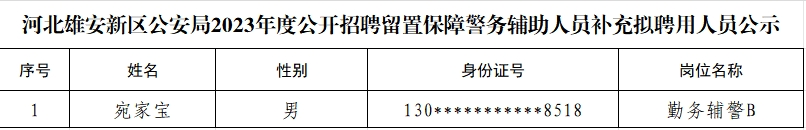 附件:河北雄安新区公安局2023年度公开招聘留置保障警务辅助人员补充拟聘用人员公示